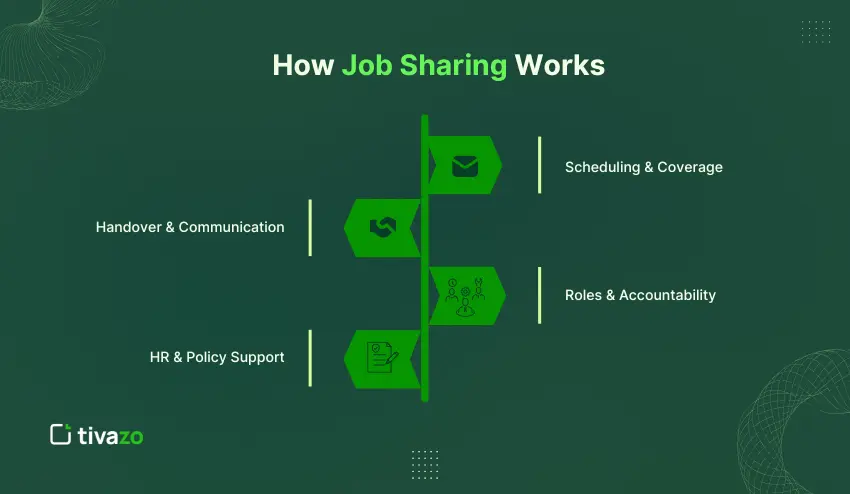 Job sharing is a flexible work arrangement where two employees split the duties of one full-time job. They coordinate schedules, responsibilities, and outcomes to ensure seamless coverage.