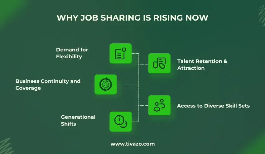 Job sharing is not a trend, it is an adaptation to the changing demands of the employees and the organization. Its popularity is being fueled by several factors: