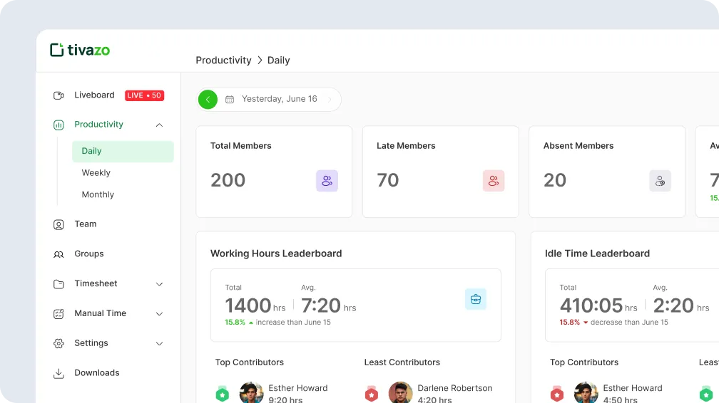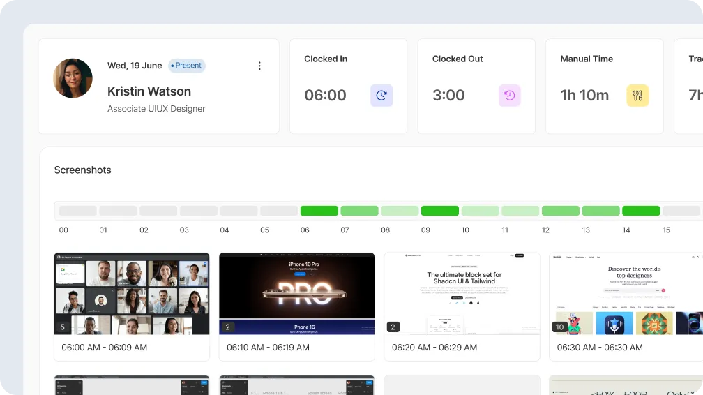Get real-time visibility into employee activity, tracked hours, productivity levels, and performance trends from a single dashboard.